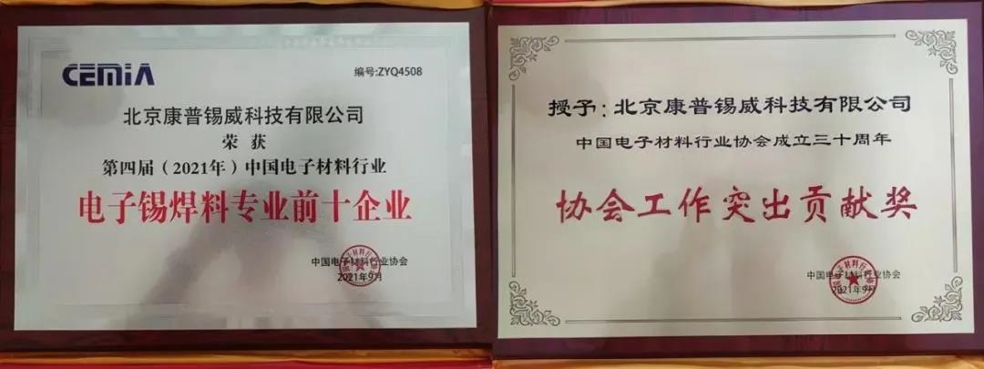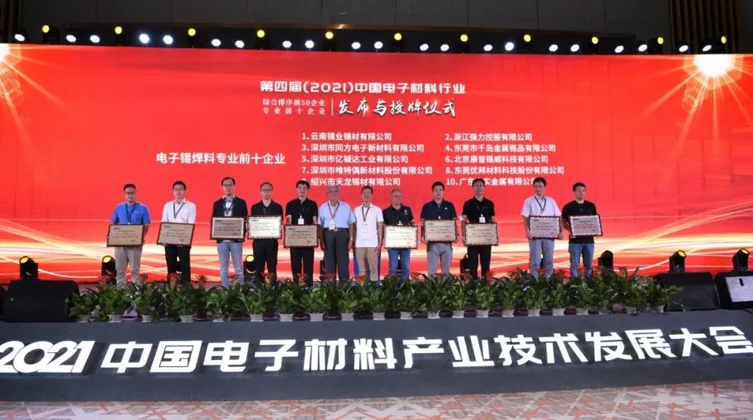 大會期間還進行了第四屆(2021年)中國電子材料行業綜合排序前50企業及半導體材料等八個專業前十企業榜單發布與授牌儀式。中國工程院院士、中國科學院院士以及中國電子材料行業協會領導等為獲獎企業代表頒獎。我公司繼續入圍“電子錫焊料專業前十企業”。