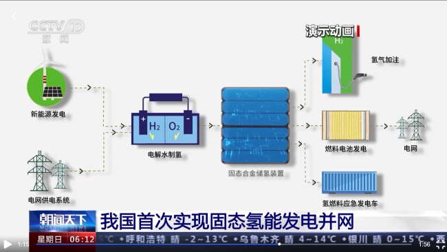 3月25日,由中國(guó)有研所屬有研工研院與有研廣東院聯(lián)合自主研發(fā)設(shè)計(jì)制造的規(guī)模儲(chǔ)氫裝置與分級(jí)靜態(tài)氫壓縮裝置成功應(yīng)用于南網(wǎng)云南綜合能源站與廣州南沙電氫智慧能源站。這是我國(guó)首次將光伏發(fā)電耦合固態(tài)儲(chǔ)氫應(yīng)用于電力系統(tǒng),同時(shí)也是國(guó)內(nèi)首次實(shí)現(xiàn)固態(tài)儲(chǔ)供氫增壓加氫及發(fā)電綜合應(yīng)用,實(shí)現(xiàn)了“綠電”與“綠氫”靈活轉(zhuǎn)換。該進(jìn)展被中央電視臺(tái)新聞聯(lián)播及朝聞天下關(guān)注與報(bào)道。