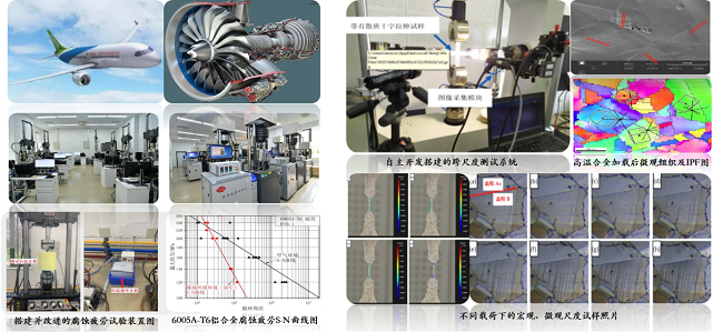 值得驕傲的是在航天航空領域,我們通過創新測試技術為國產大飛機翱翔藍天保駕護航。圍繞航空發動機葉片用高溫合金,開發16項測試評價方法,形成3項國家行業標準,研制鎳基高溫合金全元素測定方法和5類標準物質,極大補充完善了現有高溫合金測試評價體系。自主研制的腐蝕疲勞試驗裝置,為大飛機用鋁合金結構材料的壽命評估提供了科學有效的研究手段;跨尺度評價系統,實現了從微米級到厘米級的材料組織和性能的實時動態測量,為高溫合金變形、斷裂、失效分析提供了全新的研究手段,填補了國內在跨尺度評價相關技術領域的空白。
