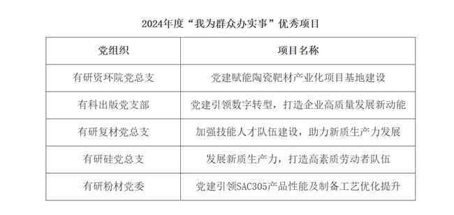 2024年度,各級黨組織聚焦本單位有關科技創新、生產銷售、深化改革、人才發展、職能管理、職工權益等方面的難點、堵點、痛點工作,在集團立項19個“我為群眾辦實事”項目。經組織評審組專家答辯評審、結題評審等,共評出6項年度“我為群眾辦實事”金牌項目、5項優秀項目,名單如下: